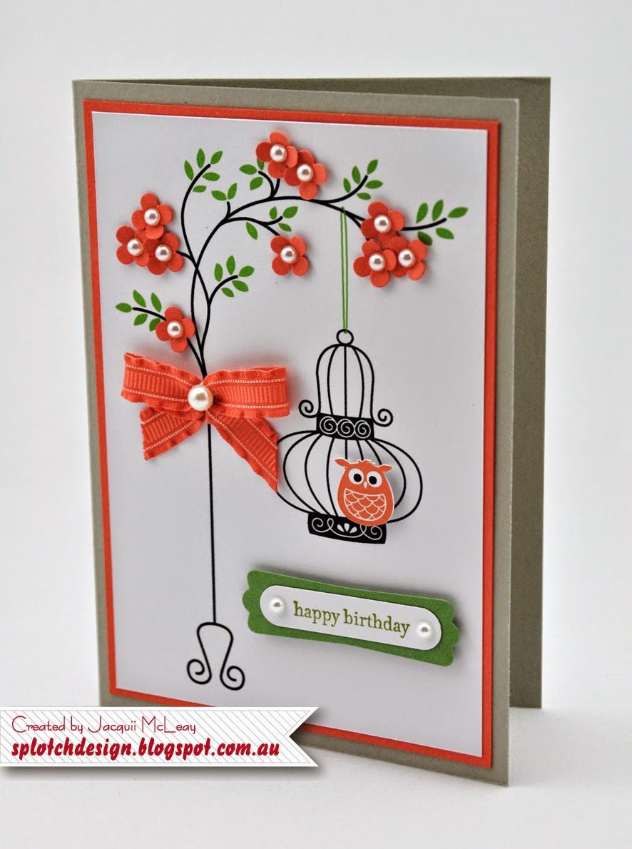 This card uses two Stampin Up stamps sets: Aviary (retired) and Thoughts and Prayers (retired). There is still a digital set of aviary stamp set available and it has four different bird cages and birds you can use which allows you to make many different versions of this card. There are also many different tree/branch or plant stamps available, so you could easily substitute the branch I used for something else.